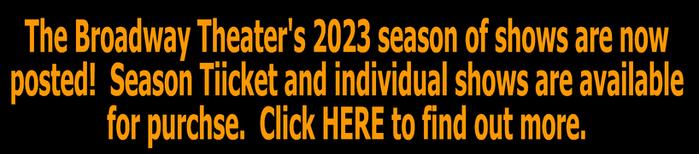 If you would like to donate to the Broadway Theater - and be listed in our season program as a BROADWAY BABY - simply fill out the donation form and click 'submit' at the bottom of the form. Everyone who donates will receive a personalized thank you card from the owners along with your name printed under the BROADWAY BABIES in each of our main stage programs. We have a lot of great stuff coming up for in the new year and we can't wait to see you back at the theater in 2025!